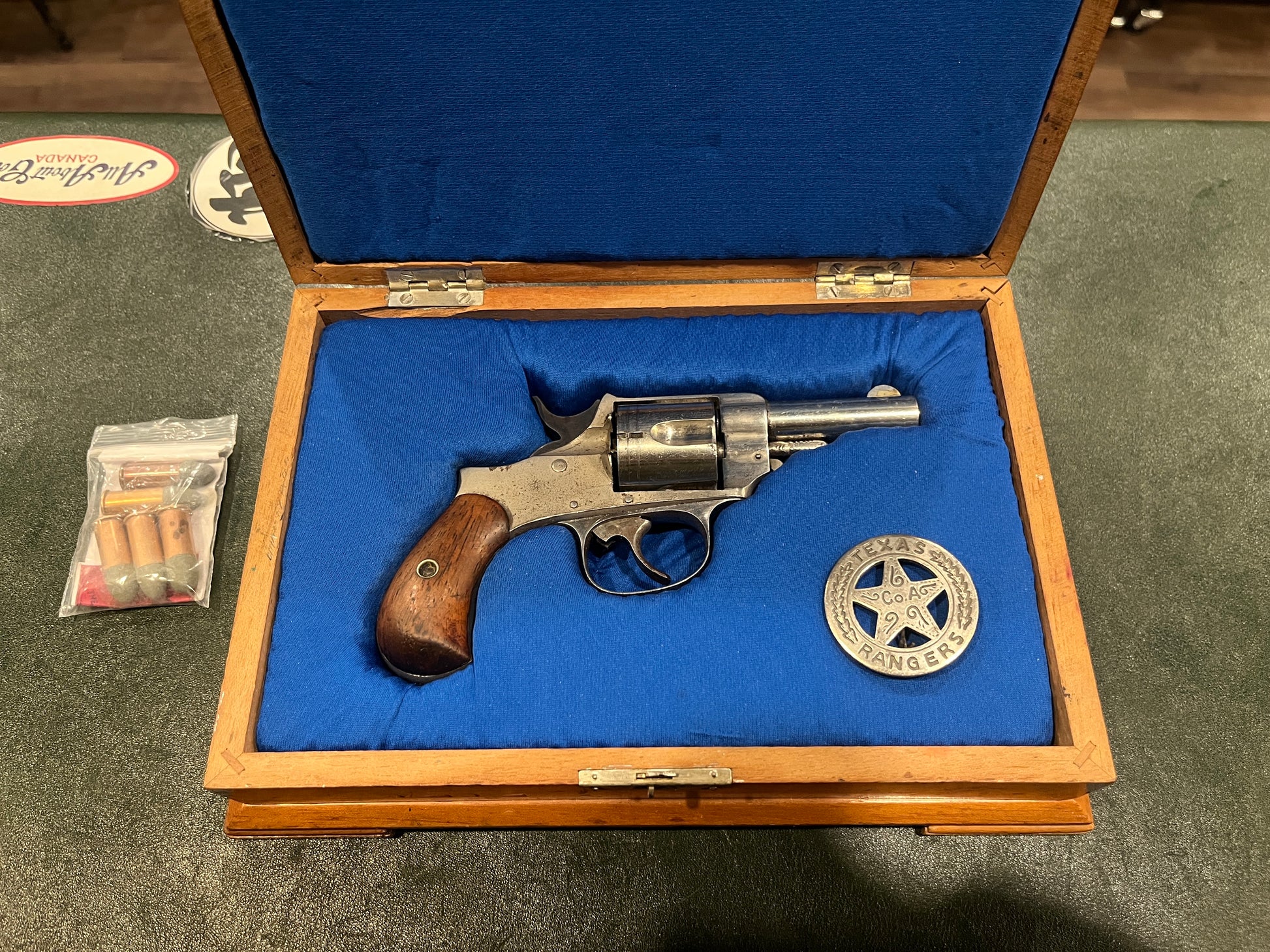 This revolver is mechanically functional and represents a classic example of Forehand & Wadsworth’s small-frame double-action designs popular during the Victorian era. It comes housed in a custom wooden display case lined with blue velvet and includes a Texas Ranger commemorative badge, adding to its presentation appeal.