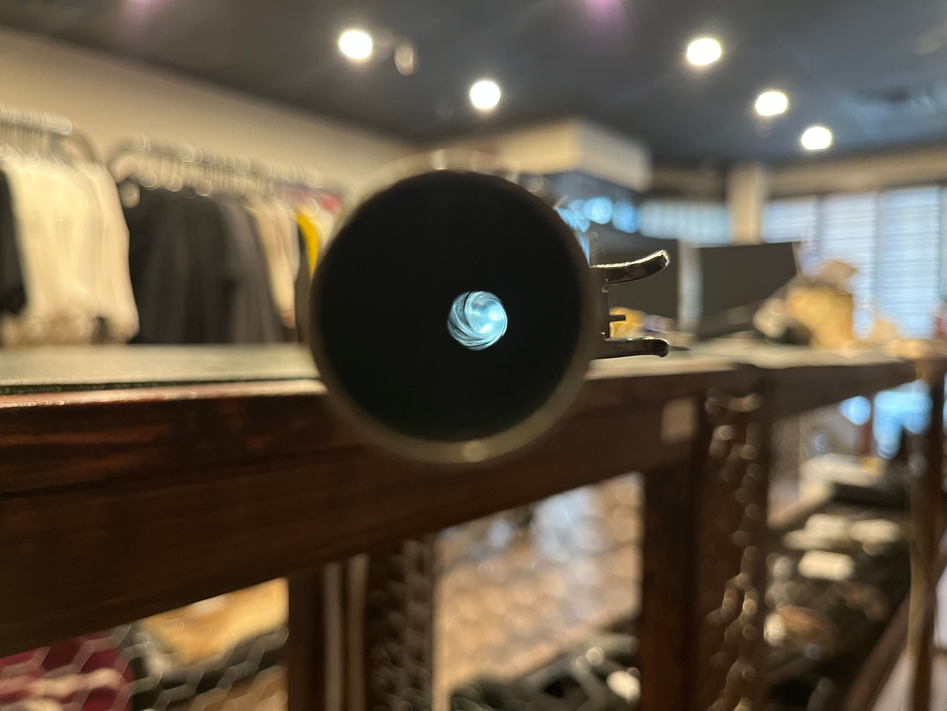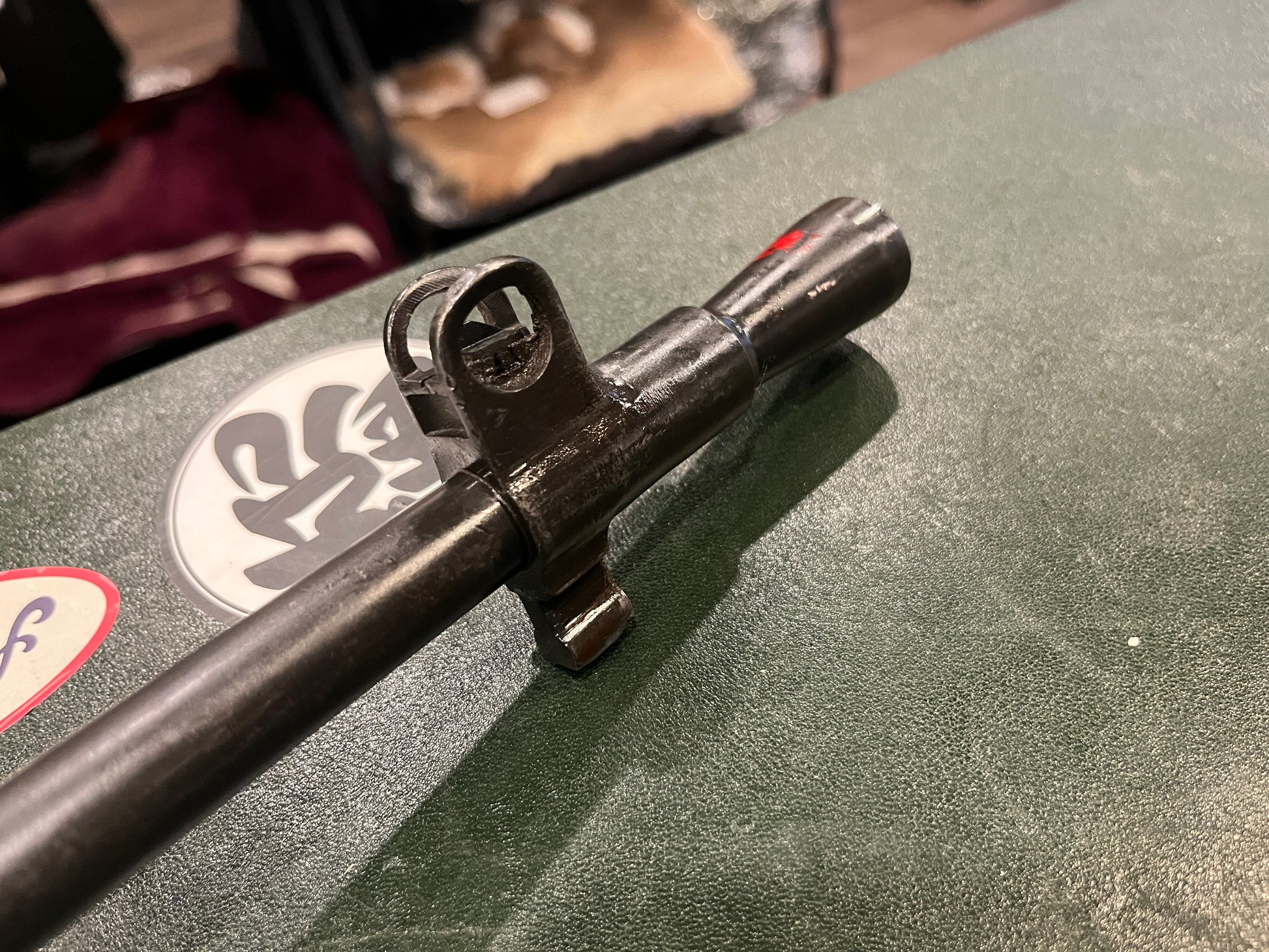 Cet exemplaire est équipé du guidon classique à lame avec oreilles de protection et rampe , ainsi que d'une mire arrière réglable et fraisée, graduée à 800 yards . Le fusil conserve sa finition en métal bleui , présentant des zones d'usure, des rayures et des marques de manipulation typiques du service. Il est monté dans le traditionnel meuble militaire en bois dur en trois parties avec poignée pistolet, présentant des coups, des rayures et des traces d'usure. Il est équipé d'émerillons de bretelle et d'une bretelle en toile de reproduction modèle 1937. La crosse conserve le coussin de couche en caoutchouc noir caractéristique de la Jungle Carbine.