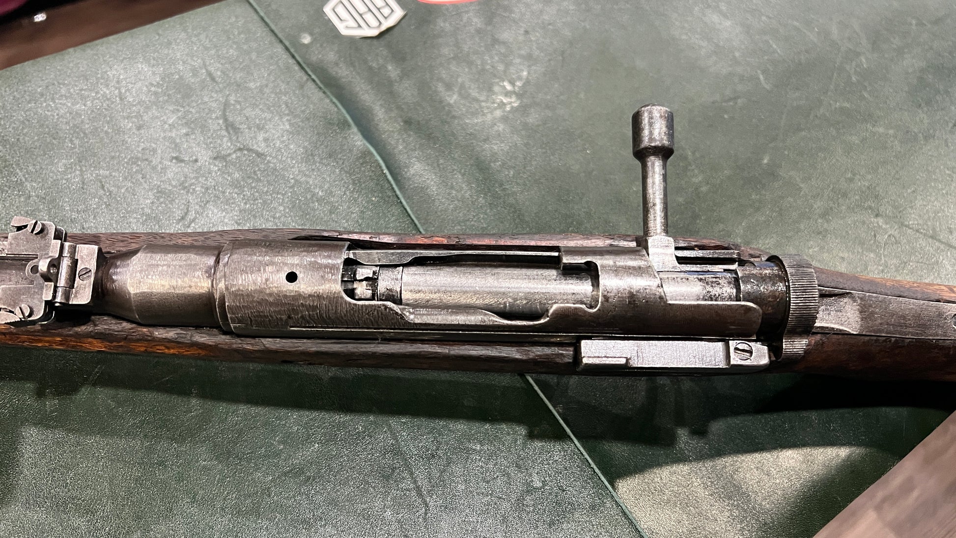 État : La crosse présente des signes d'usure liés à la guerre, avec des bosses et des rayures compatibles avec une utilisation sur le terrain ; l'alésage reste solide avec des rayures visibles
