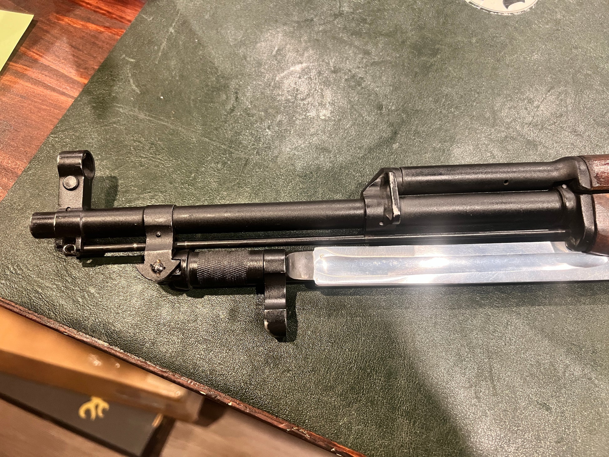 The rifle retains its classic hardwood stock along with the original blade style bayonet. The stock shows honest service wear including handling marks and light impressions, adding to its authentic military character.