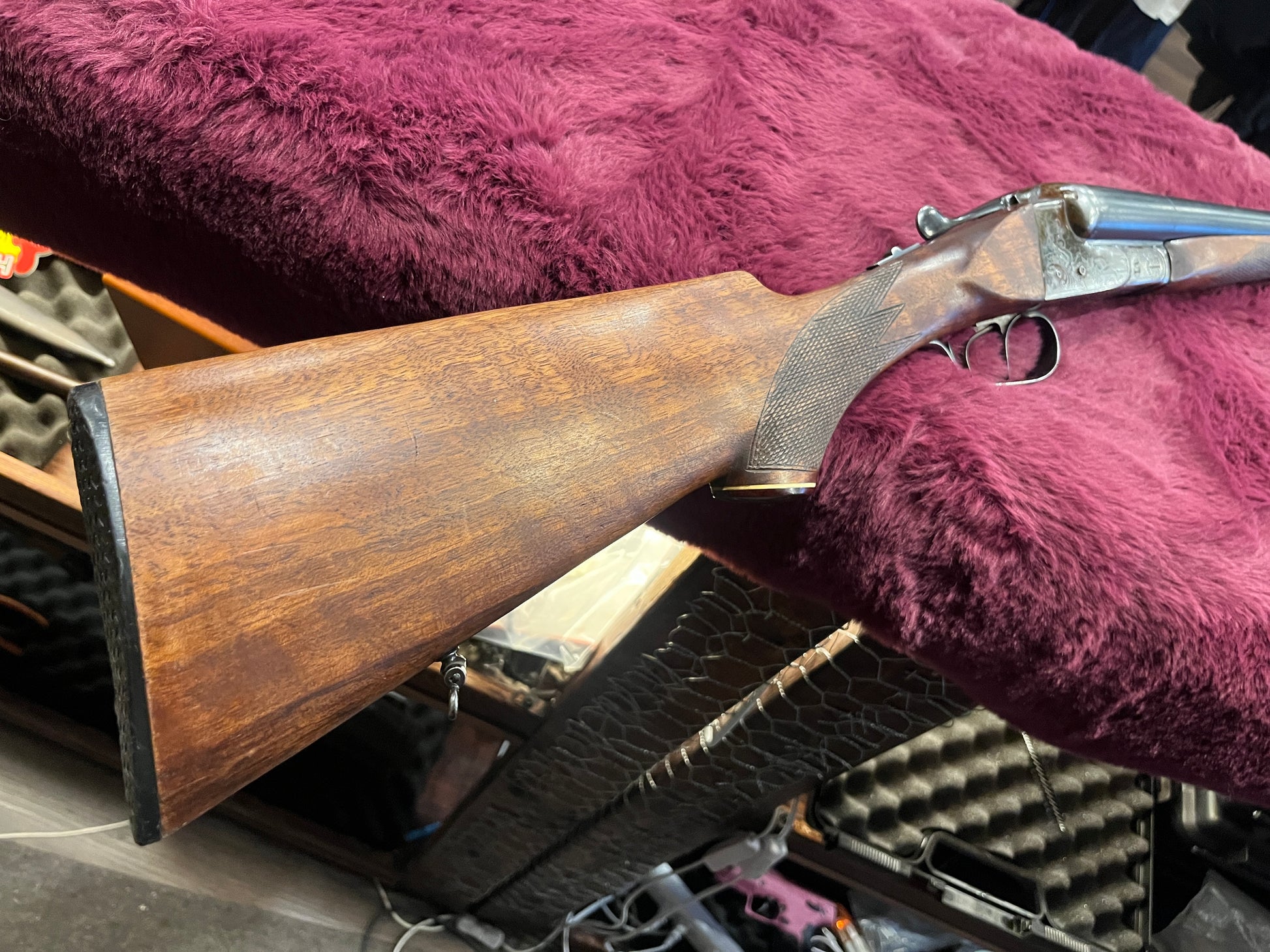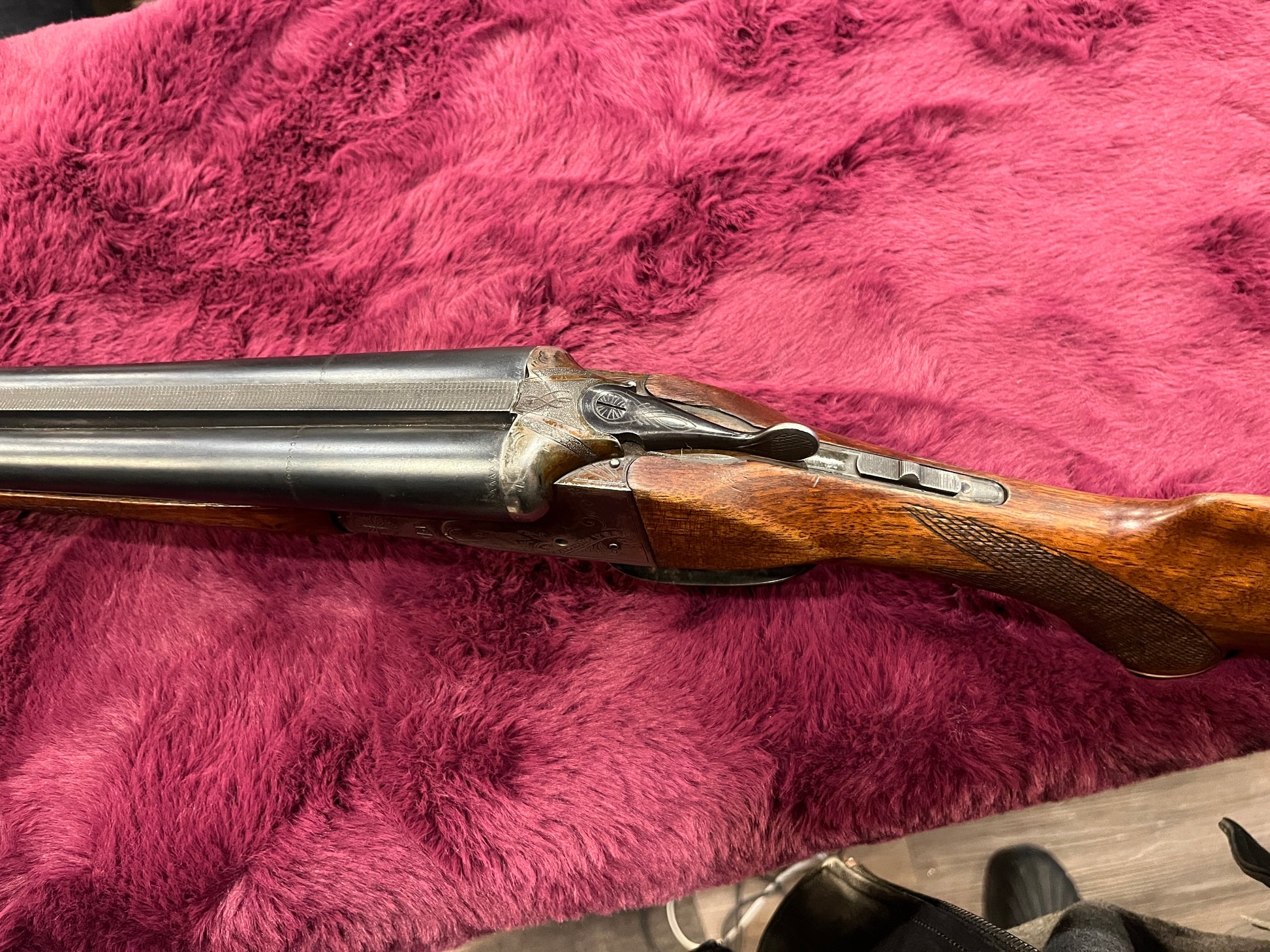 Action and metalwork: Receiver retains original color casehardening tones with engraved game scenes and foliate borderwork showing wear and patina consistent with age. Barrel finish shows wear and handling marks; barrels lock up securely and hinge functions as expected.