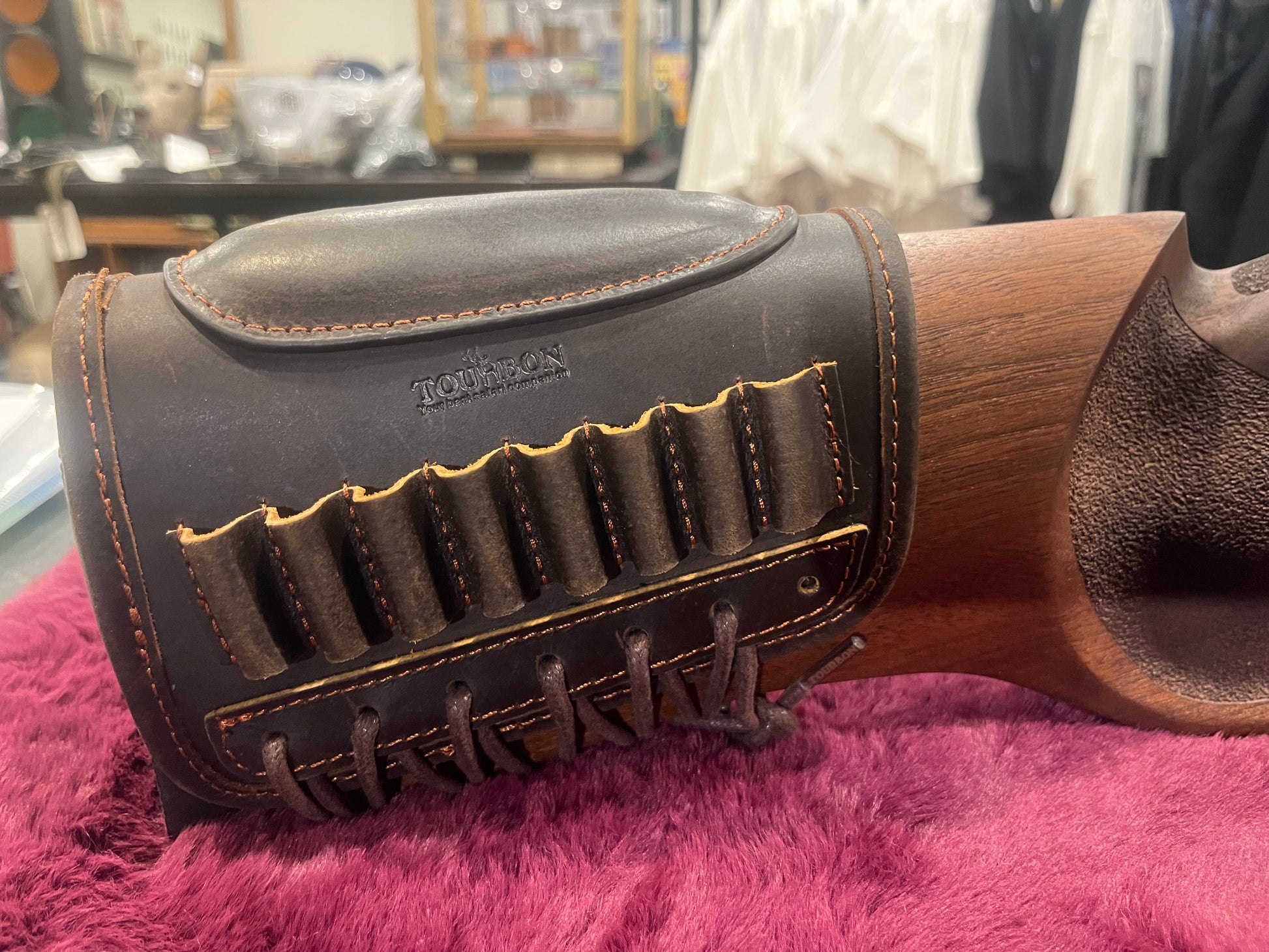 • Leather cheek pad with cartridge loops fitted to stock.