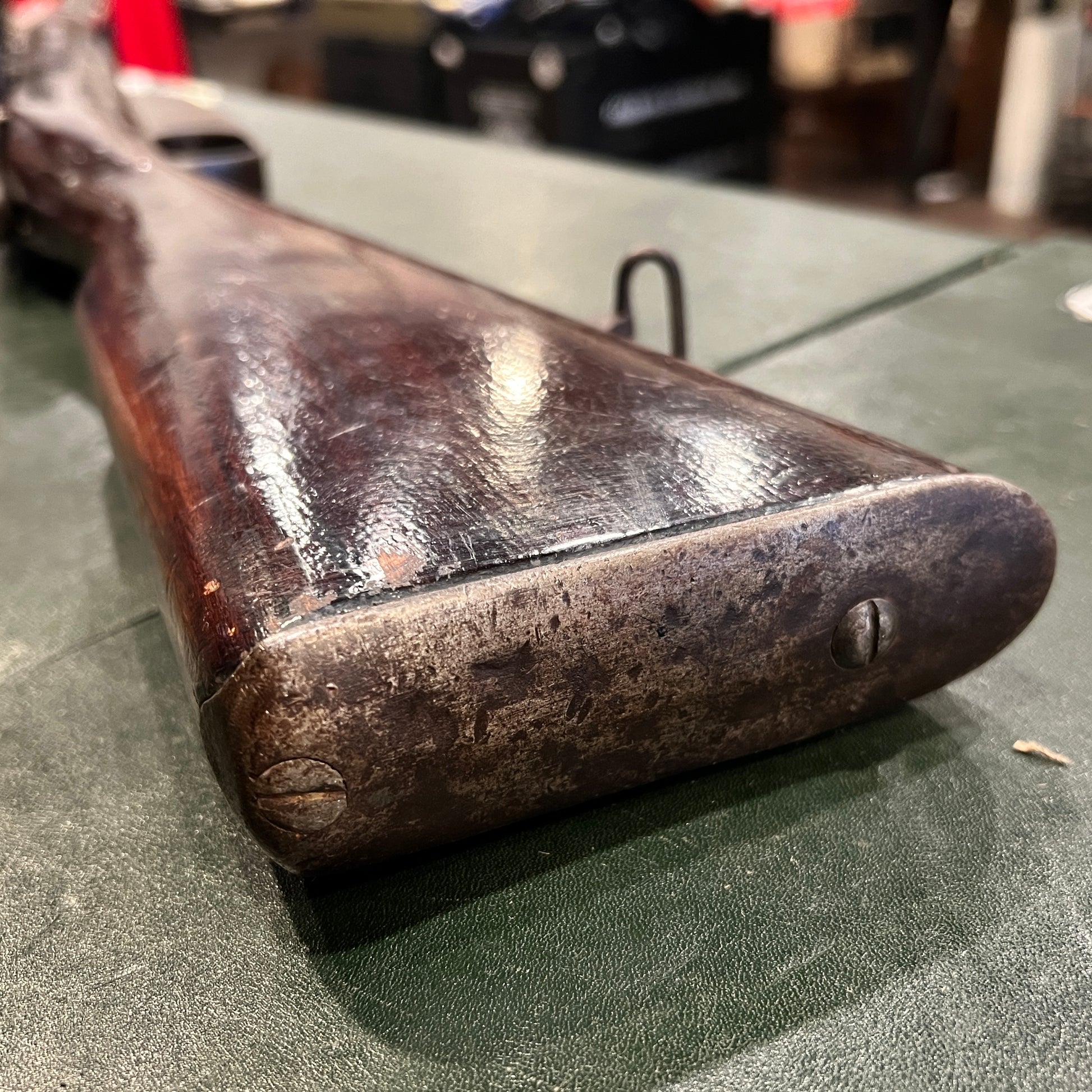 The stock has been refinished at some point, with visible sanding and re-oiling. Portions of the original stock markings remain faintly visible.