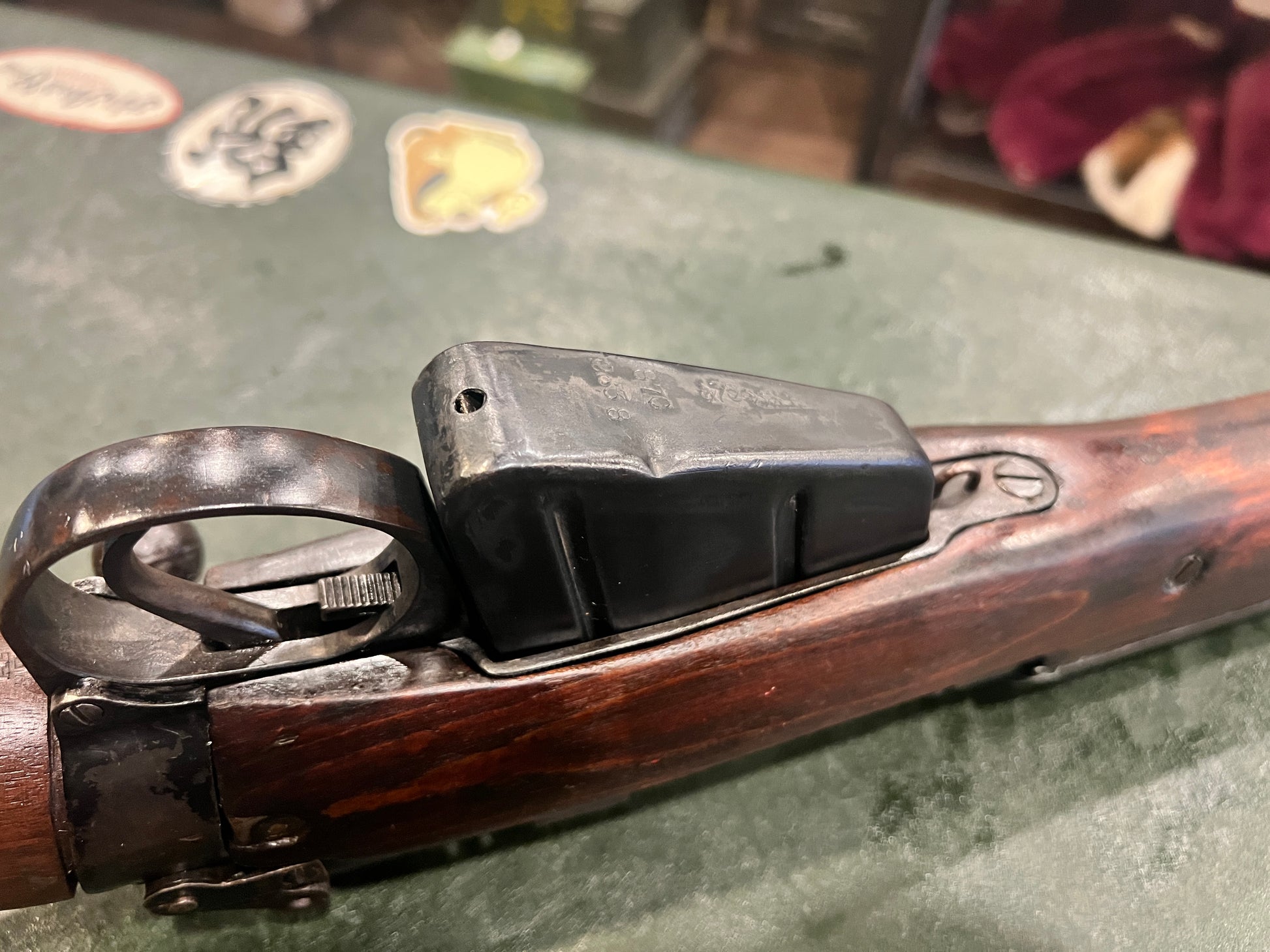The magazine is not matching to the rifle and shows a small dent, but remains functional. For improved appearance or consistency, it can be replaced with a non-numbered magazine.