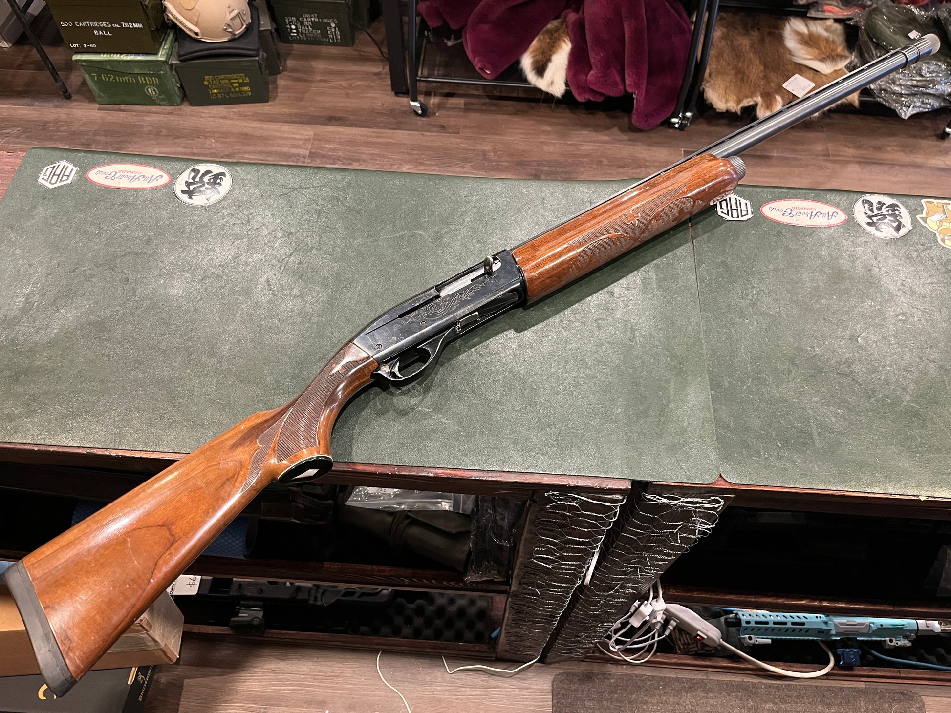 The shotgun is fitted with attractive factory walnut furniture showing classic Remington pressed checkering and decorative inlays on the forearm and pistol grip. The receiver retains factory scroll engraving, giving the shotgun a refined and traditional sporting appearance. Metal finish remains in very good condition with normal handling marks consistent with responsible ownership and use.