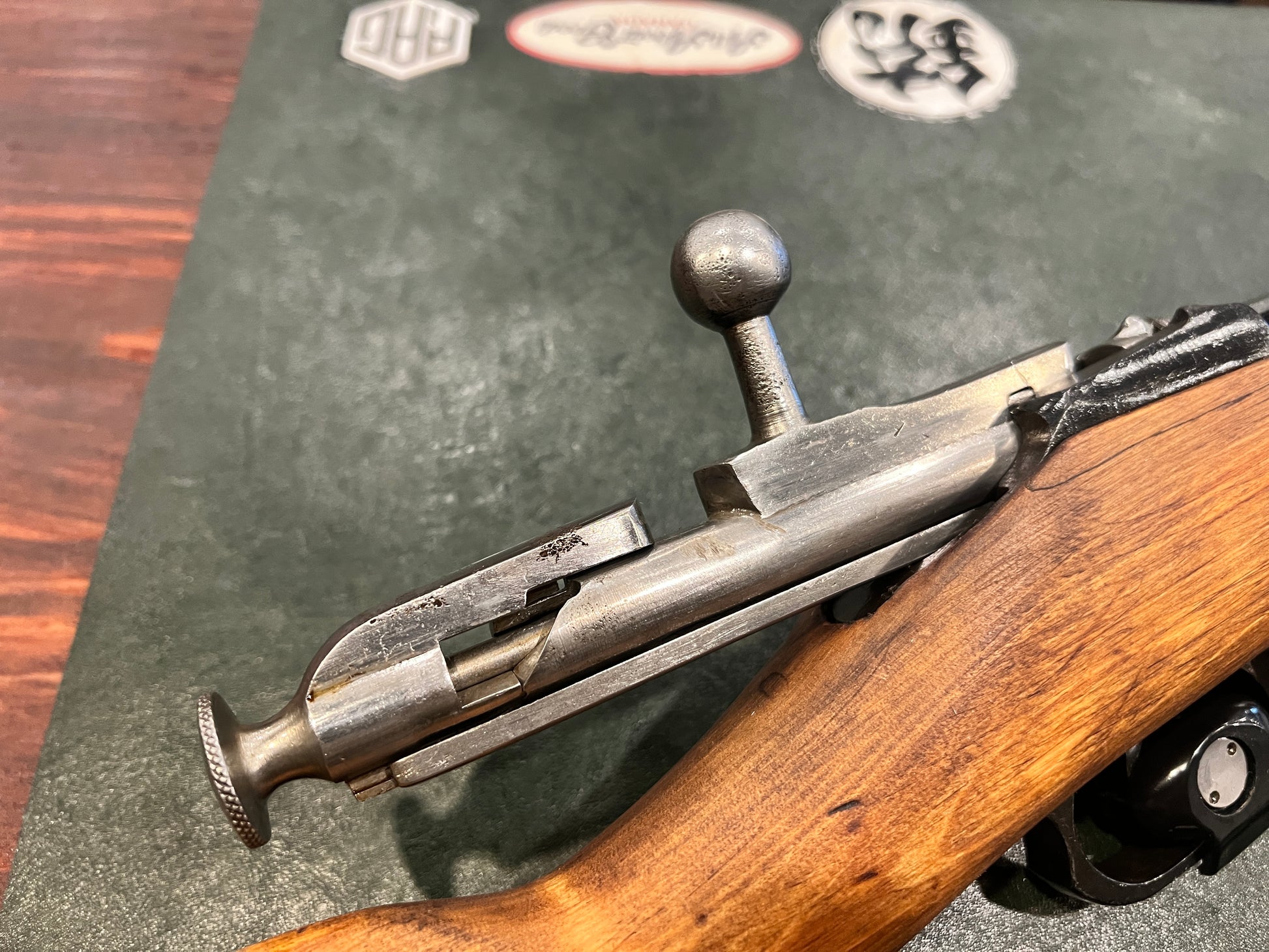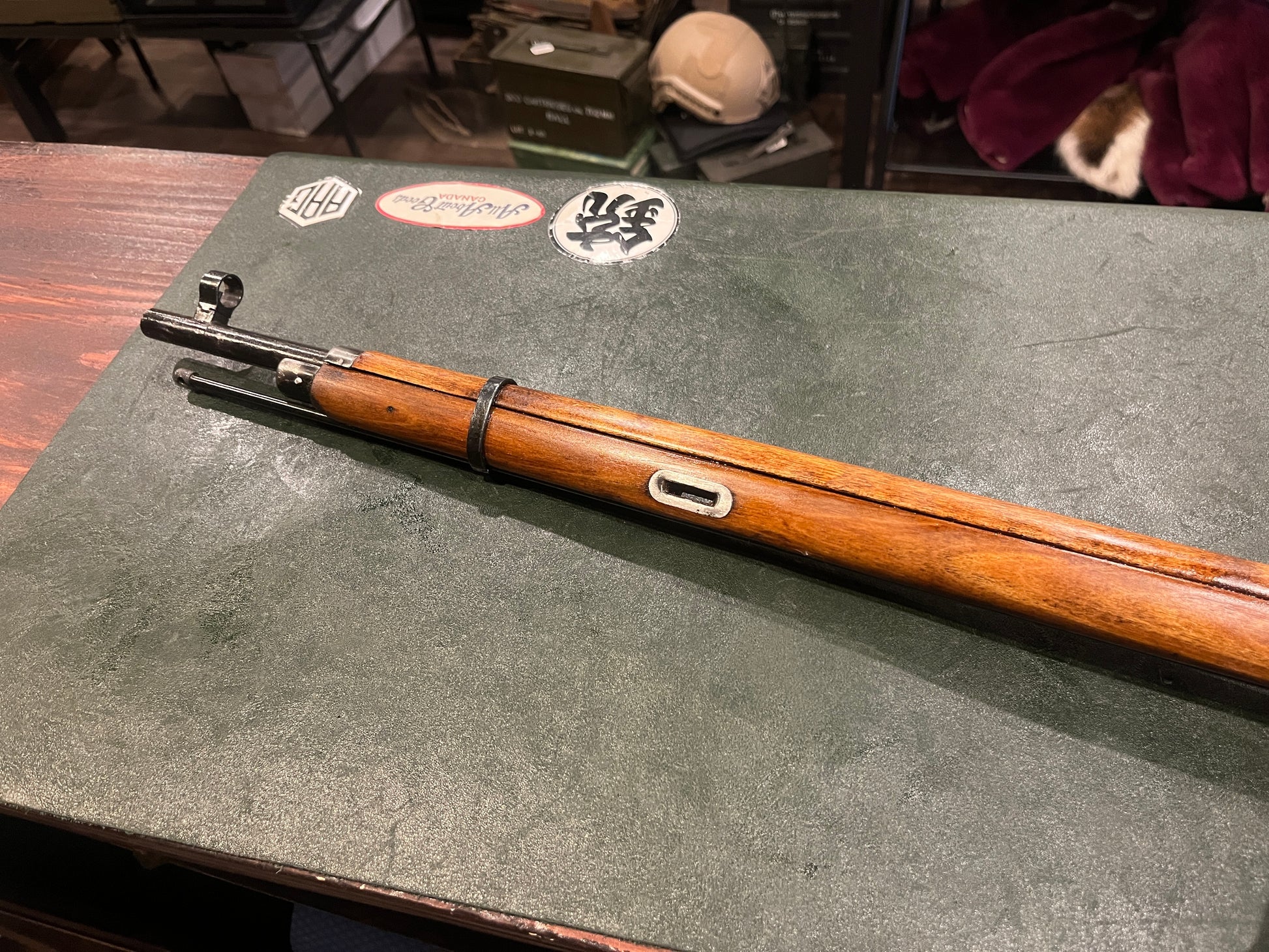 The rifle is fitted with a full-length military stock that remains solid and structurally sound. The stock shows normal service wear, storage marks, and finish aging consistent with surplus military rifles. The metal finish remains in good service condition with expected handling marks.