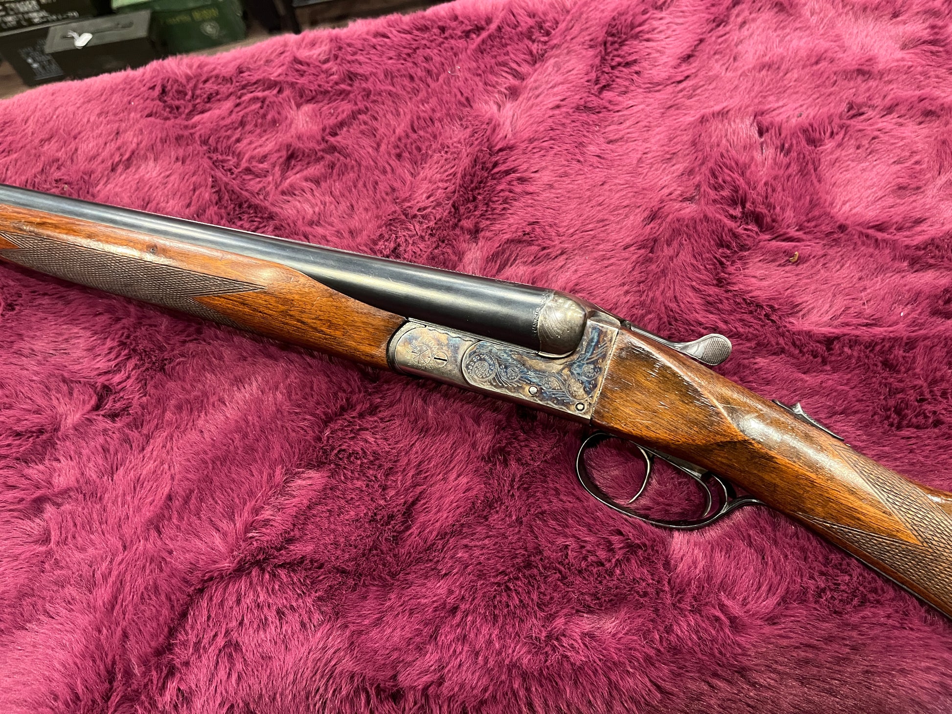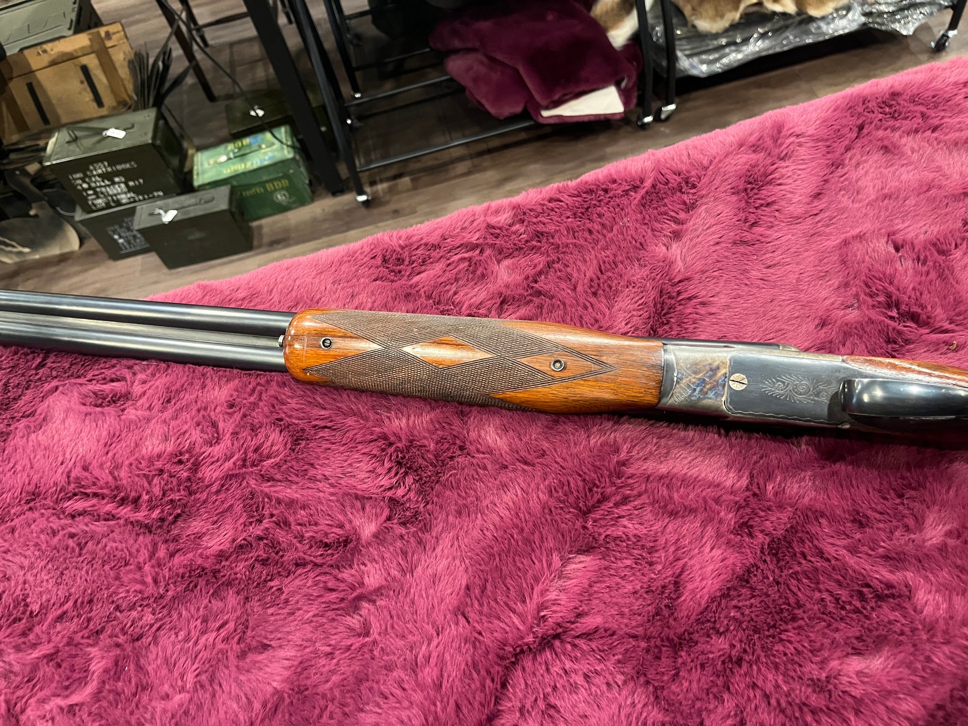 This Spanish Arms BOST side-by-side shotgun is a traditional tip-up double in 12 gauge (3″ chambers). The case-hardened action remains tight and smooth, and the barrels measure 28″ with bright, clean bores rated good to very good. Bluing is good to very good overall with only minor handling marks. It features twin triggers, a top lever, and a bead front sight.