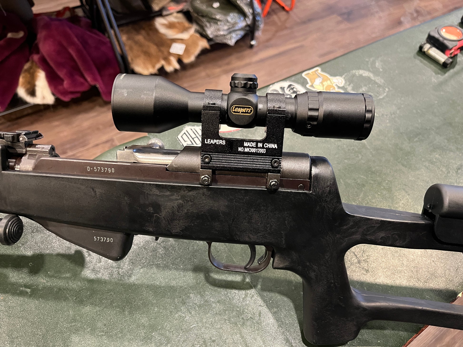 The rifle is currently installed in an aftermarket polymer tactical stock featuring an adjustable cheek rest and ergonomic pistol grip, providing improved handling and shooting comfort. The rifle is also equipped with a scope mounted via a receiver cover rail, as well as a folding bipod for enhanced stability during range use.