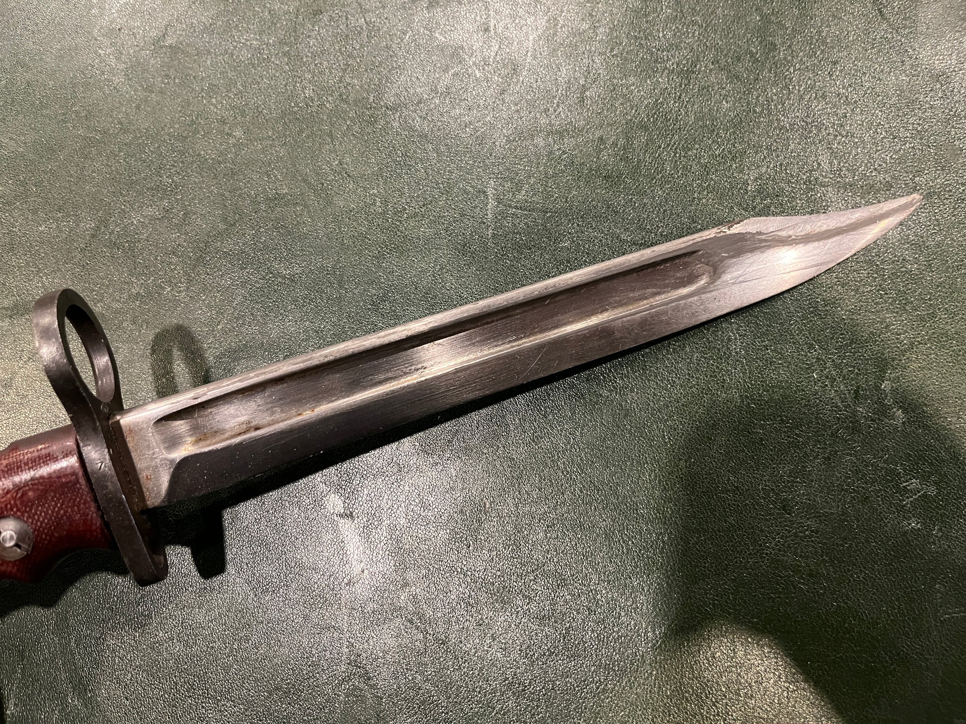 Designed as a dual-purpose bayonet, the No.7 Mk I features a rotating socket that allows it to mount on both the Sten Mk V submachine gun and the Lee-Enfield No.4 rifle. This unusual hybrid design was short-lived due to high production cost and limited battlefield practicality, resulting in relatively low overall numbers and strong collector interest today.