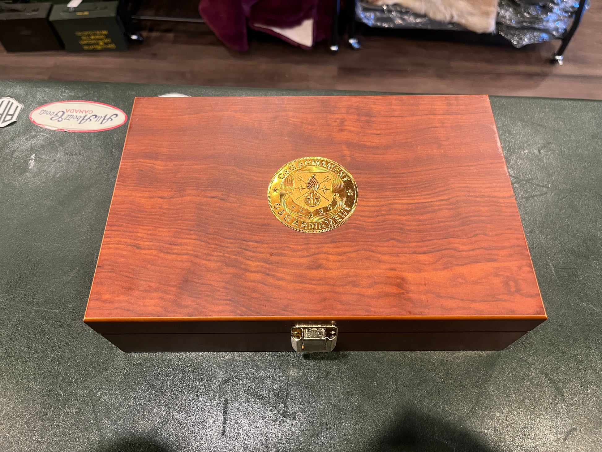 This exclusive model comes in a premium wooden presentation case with the G&G “Special Edition” gold-embossed crest, velvet-lined interior, and a numbered authenticity plaque (No.364/999). The set includes a rose gold magazine, decorative diamond-style display rounds, and a metal commemorative plate engraved with the model designation.