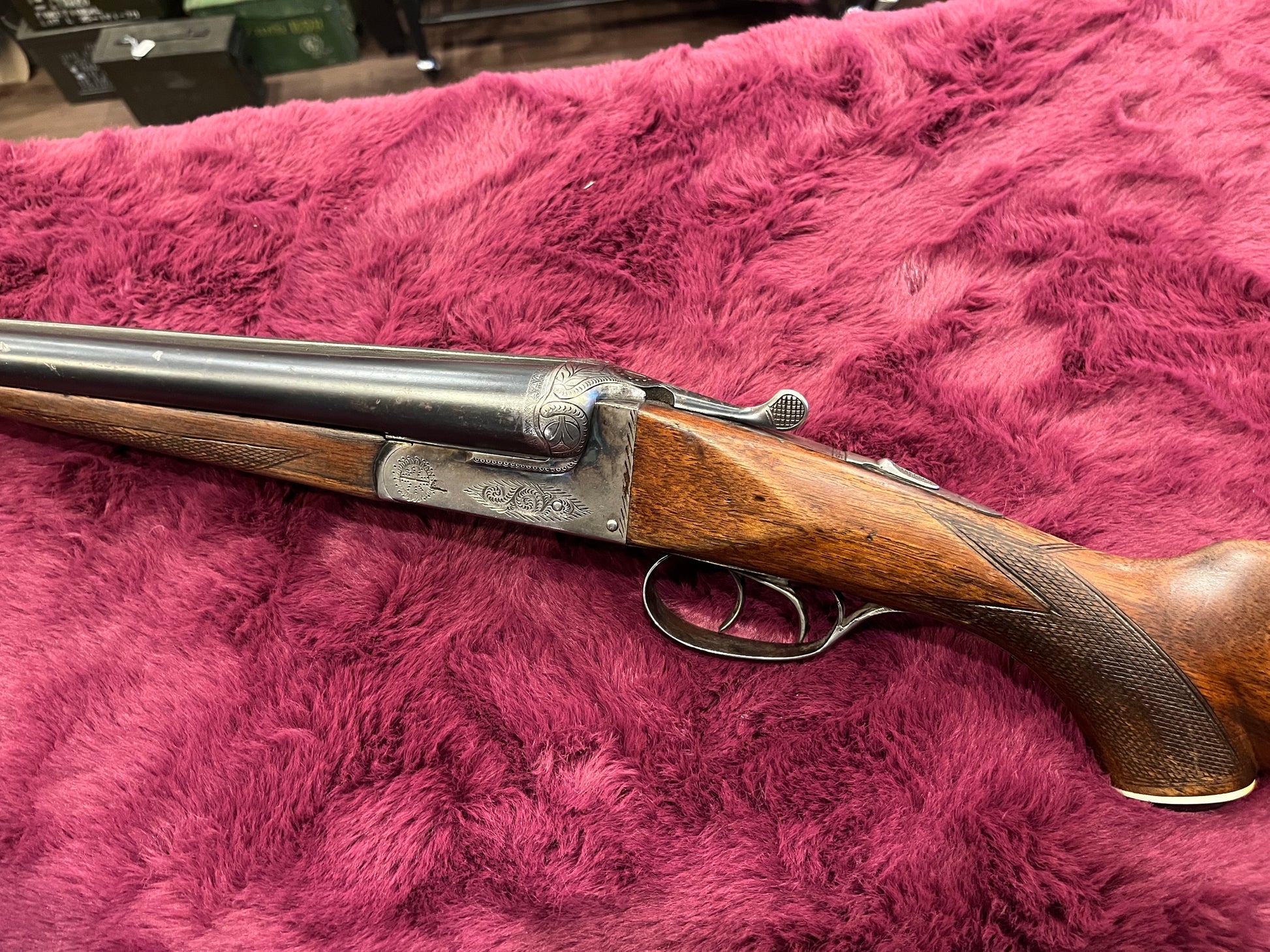 This tidy Manhela side-by-side shotgun is a classic tip-up double in 12 gauge (2¾″). The action is tight and smooth, barrels measure 27¾″ with bright bores though there are a few scratches along the barrel surfaces, and the receiver carries tasteful engraving. Exterior bluing is generally in good order with handling marks consistent with use. The stock and forearm are sound for service; note there is a very minor hairline crack at the grip/wrist area (see photos) — it does not affect the action but should be watched or repaired for long-term durability. Twin triggers, top lever and bead front sight are all present and functional. A great shooter or restoration candidate for someone who appreciates traditional SxS ergonomics.