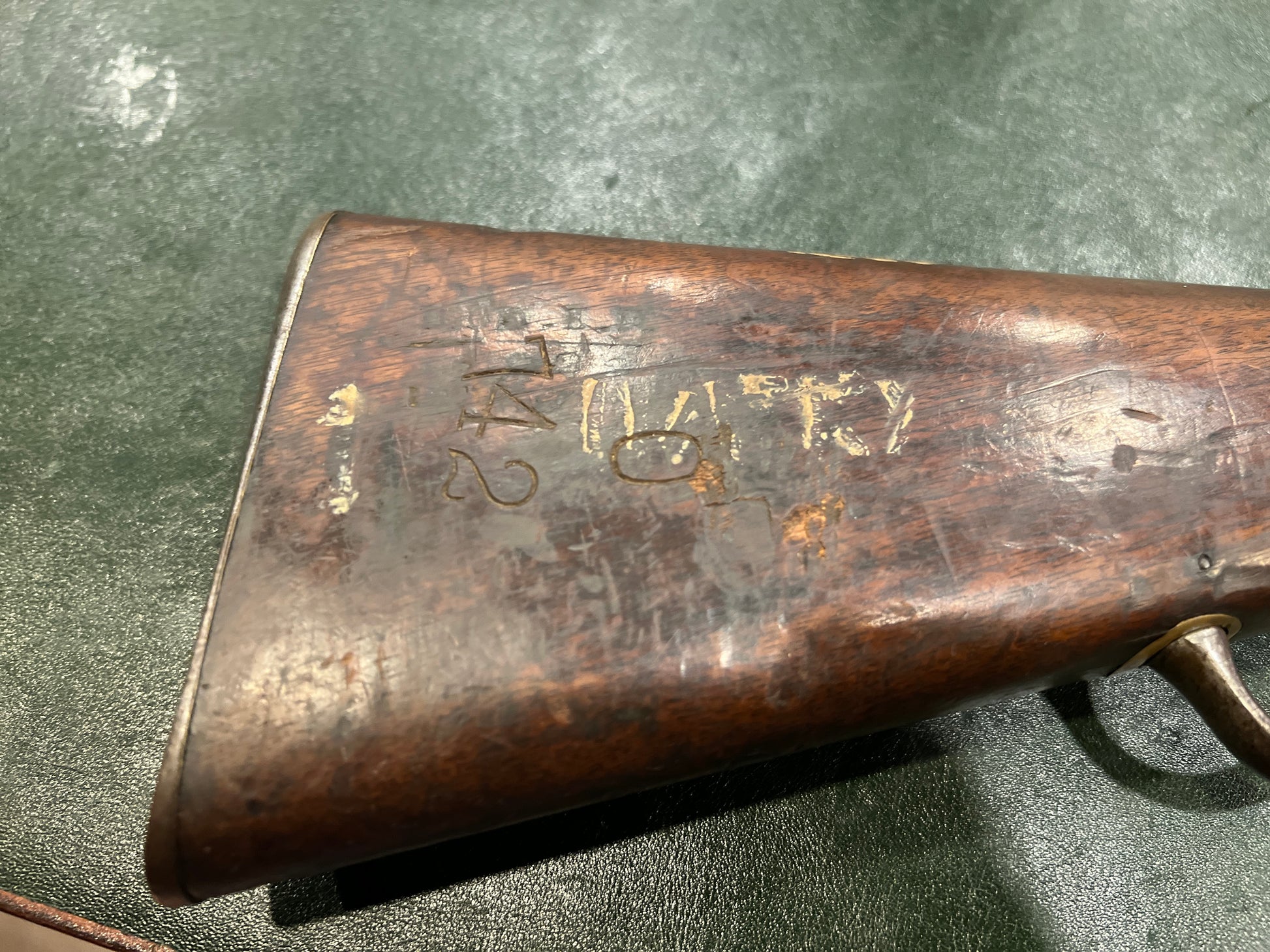 The rifle retains its correct Mk IV pattern long forend, barrel bands, sling swivels, and the original cleaning rod. Wood shows honest field wear with period carvings on the buttstock, adding unique character and history.