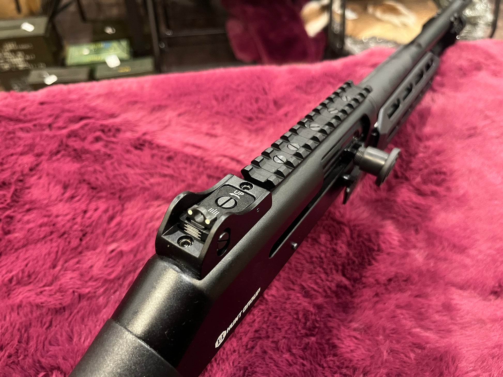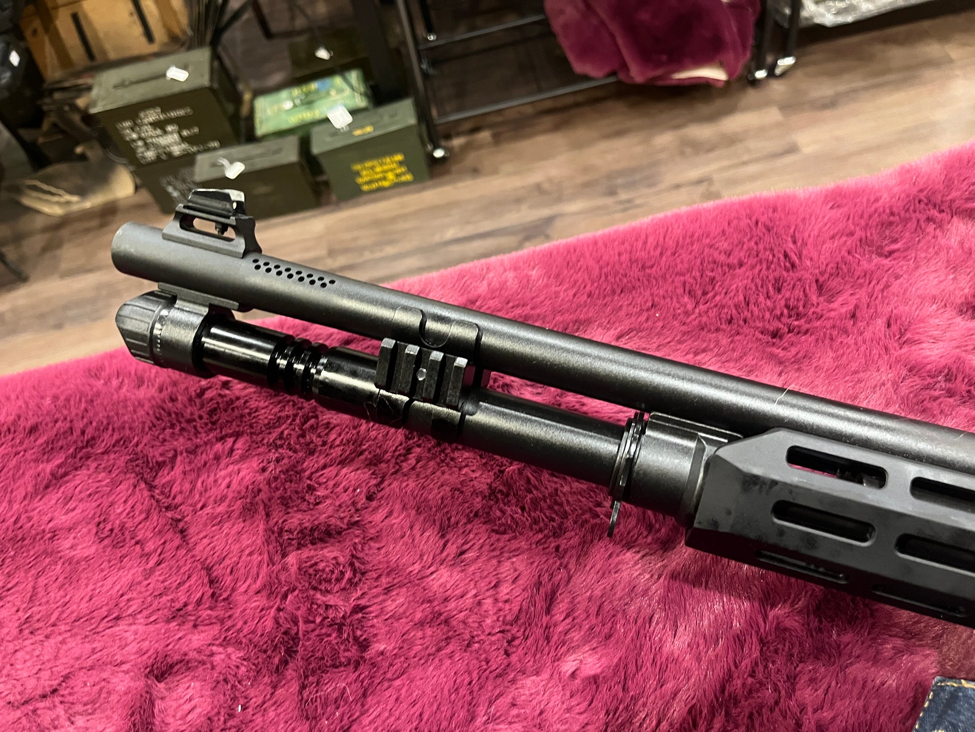 Hunt Group MX4 semi-automatic shotgun offered in like-new, unfired condition. This example has been stored in its original packaging and shows only light handling marks from unpacking and showroom handling. The MX4 blends a classic rugged receiver with modern ergonomics — adjustable buttstock, textured pistol grip, M-LOK style forend, and a top Picatinny rail for optics or sights — making it a versatile choice for range use or as a tactical-style field shotgun.