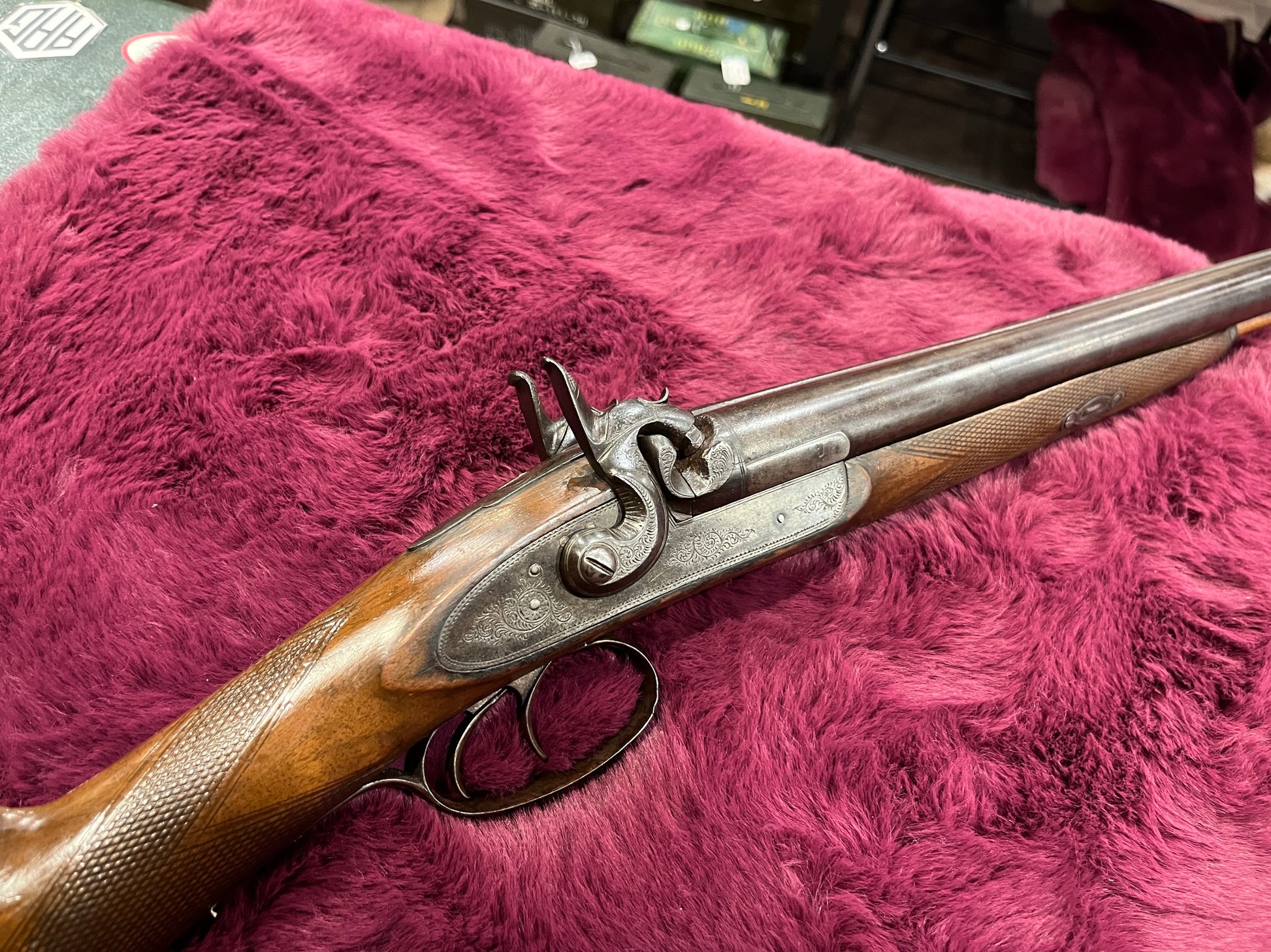 Percussion-style double-barrel black powder shotgun, side-by-side configuration with twin external hammers and double triggers. The firearm features a finely checkered wooden stock, engraved lockplates, and metal parts showing an aged patina.
