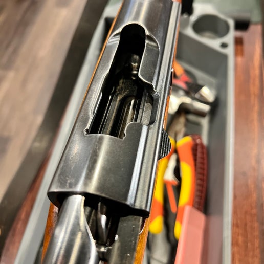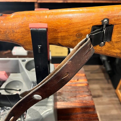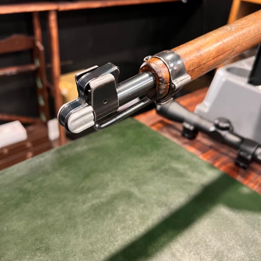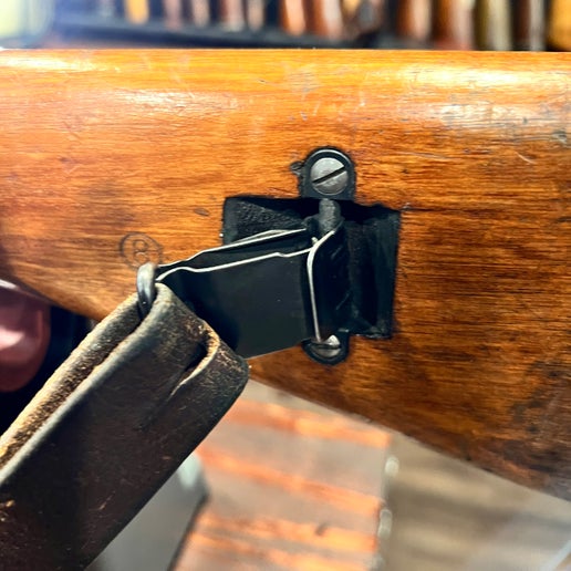 胡桃木枪托上留有轻微的枪托痕迹,这是现役步枪的典型特征,但无明显裂纹或修补痕迹。护手和枪托结构坚固,保留了经典的红棕色调和原有的光泽。