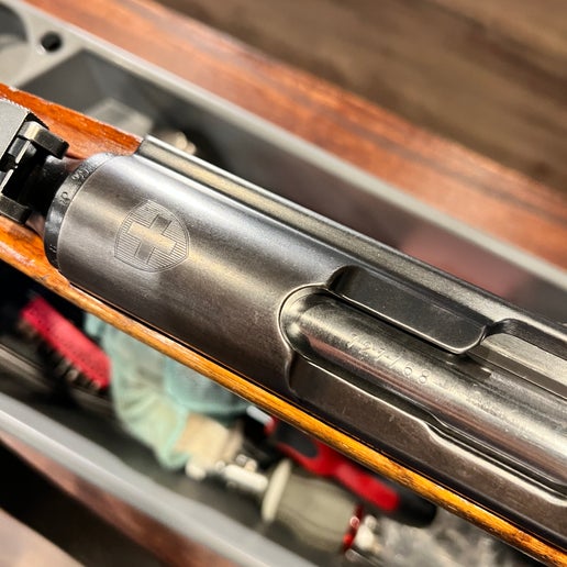该步枪机匣上带有瑞士十字勋章,伯尔尼武器制造厂(Waffenfabrik Bern)的标记清晰易读。序列号完整无损,且主要部件的序列号匹配。机匣顶部和照门标记清晰,所有硬件均为原装。