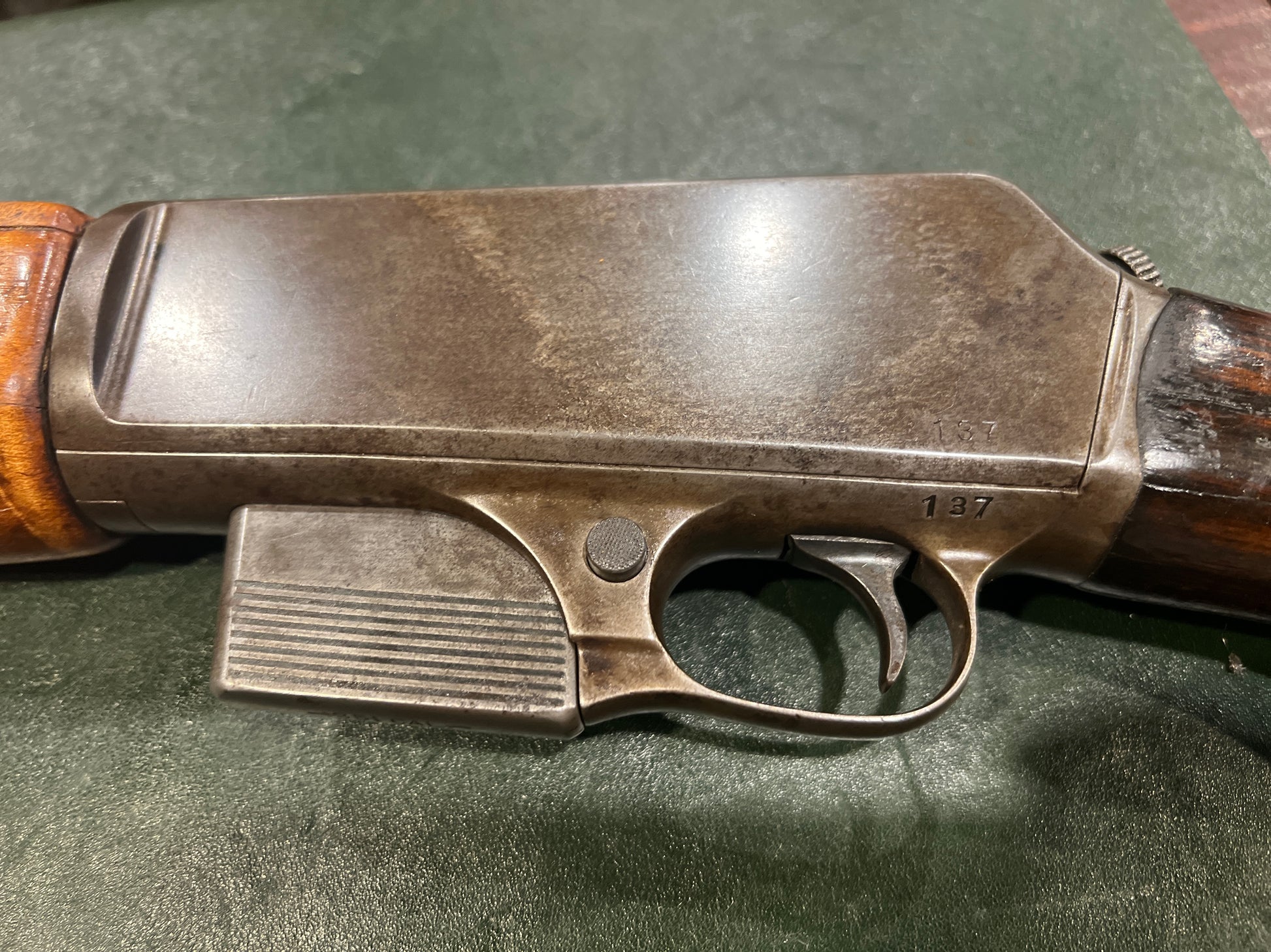 Winchester Model 1907 Self-Loading Rifle, serial number 137. This rifle is one of the earliest production examples made in 1907—only 136 units away from the very first Model 1907 ever manufactured. It stands at the true beginning of the semi-automatic rifle era. Chambered in .351SL and operating on a straight-blowback system, the Model 1907 became a cornerstone service weapon for police departments, railway security, prison guards, and bank protection units throughout early 20th-century North America.