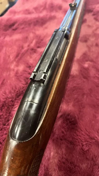 它配备一根22 英寸长的枪管,膛线干净锋利,状况良好至极佳,确保狩猎或靶场使用的稳定精度。蓝色表面保持得非常好,只有轻微的磨损痕迹,与良好的使用相符。